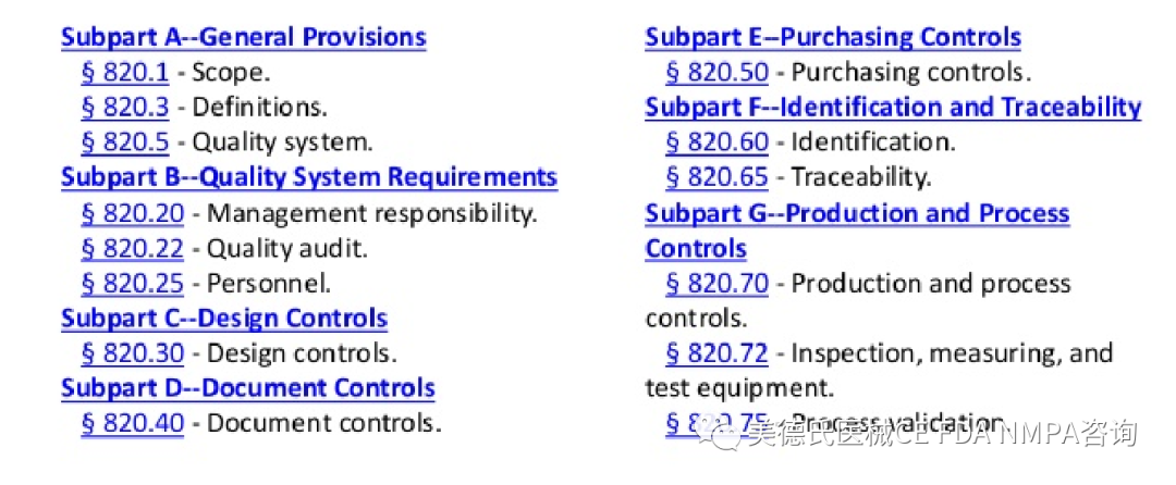 制造商必須建立并遵循質(zhì)量體系,以幫助確保其產(chǎn)品始終符合適用的要求和規(guī)格。FDA管制產(chǎn)品(食品,藥品,生物制品和設(shè)備)的質(zhì)量體系被稱(chēng)為當(dāng)前的良好生產(chǎn)規(guī)范(CGMP)。聯(lián)邦食品,藥品和化妝品法案首先授權(quán)了820部分(21 CFR 820部分)中設(shè)備的CGMP要求。該規(guī)定于1978年12月18日生效,并根據(jù)第820部分進(jìn)行了編纂。