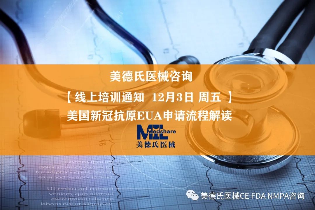 為幫助企業(yè)應(yīng)對(duì)新冠抗原FDA的EUA的申請(qǐng),美德氏醫(yī)械咨詢將于 2012.12.03日舉辦【美國(guó)新冠抗原EUA申請(qǐng)流程解讀】線上免費(fèi)培訓(xùn),特邀各企業(yè)屆時(shí)收看!